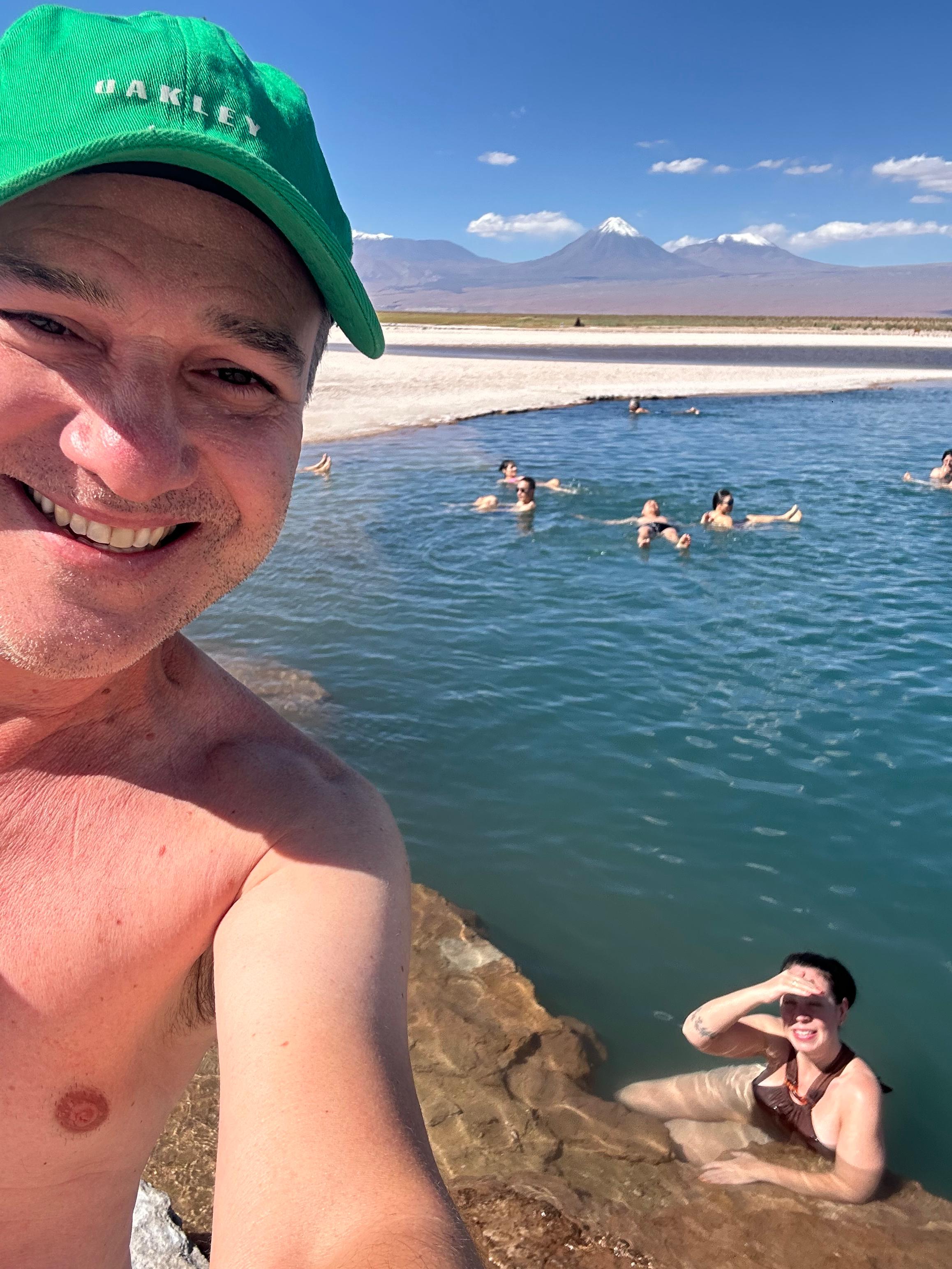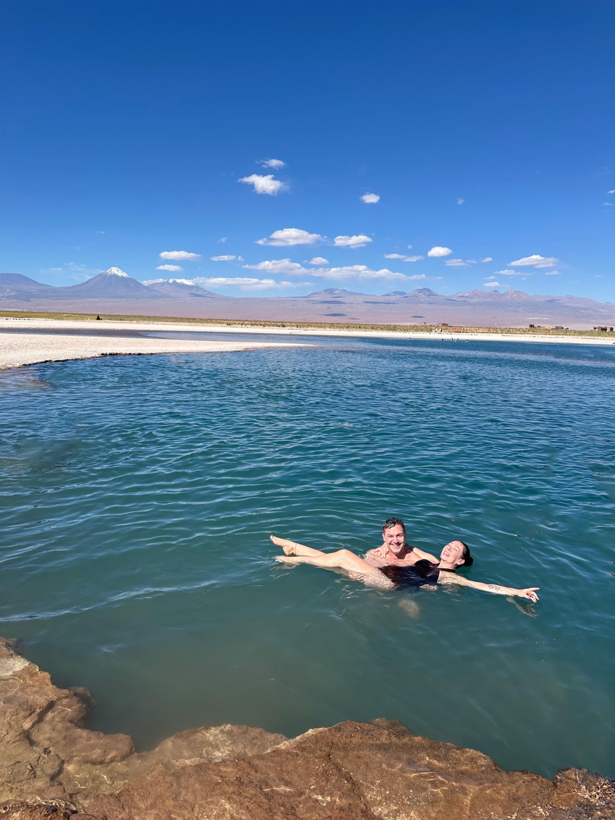 Quem diria que em pleno Atacama a gente ia boiar igual rolha na Laguna Cejar? Com 250g de sal por litro d’água, a sensação é tipo “Mar Morto, versão chilena”! 😂 Depois, o sal seca no corpo e você sai parecendo um cristal ambulante… mas relaxa, tem ducha doce logo ali pra dar aquela salvada, ufa! 😅