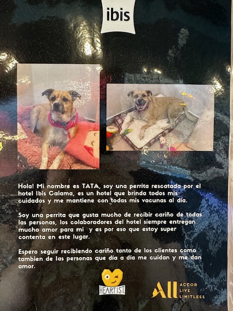 E agora, o detalhe mais especial do Ibis Calama: a Tata, uma cachorrinha resgatada que virou “funcionária” do hotel! Eles cuidam dela com muito carinho e até contam sua história em quadros na parede. Esse é um ponto que ganhou nosso coração e mostra o quanto o hotel valoriza os animais!