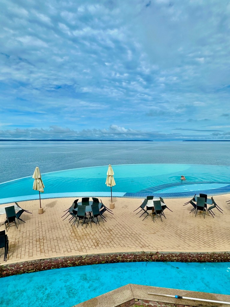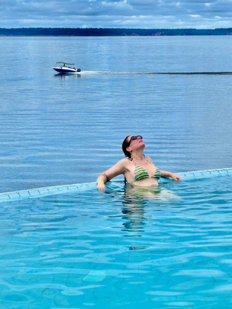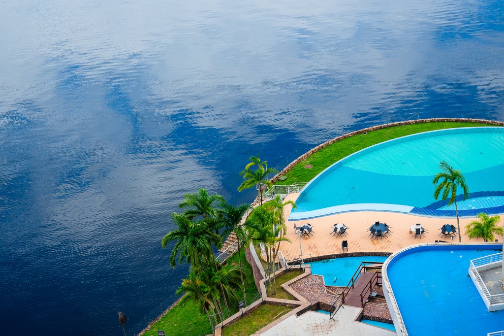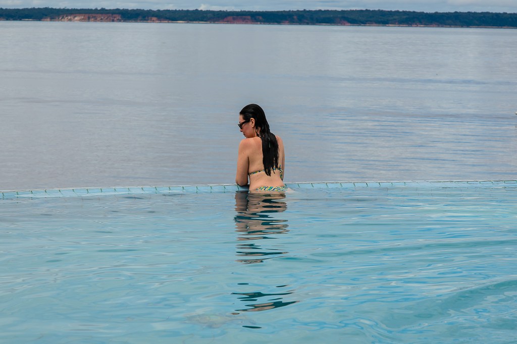 Piscina com borda infinita, quartos amplos com janelões pro Rio Negro e até elevador panorâmico (sim, o rolê começa antes mesmo de sair do hotel!).