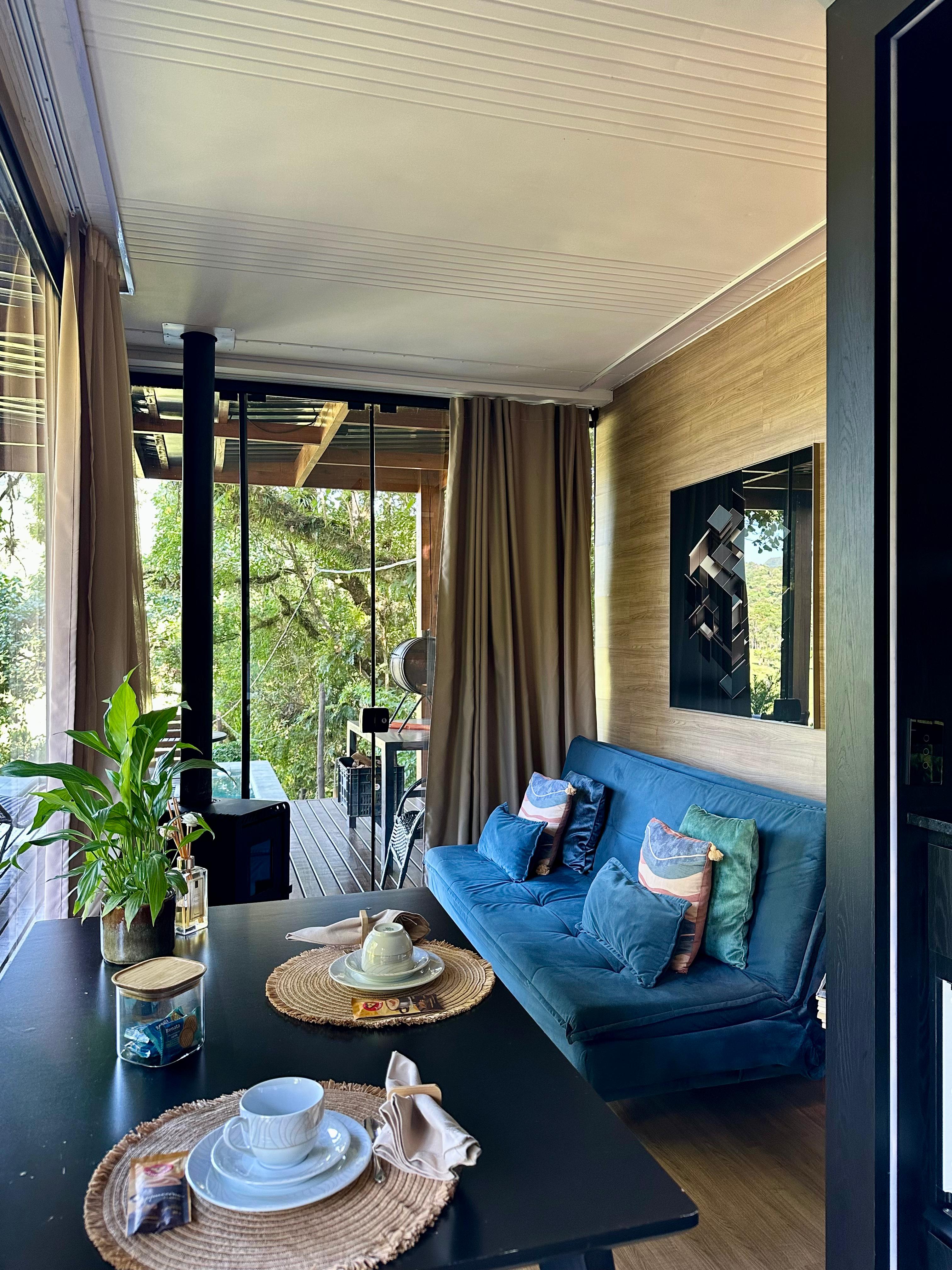 Ficamos na Cabana Udine, uma das opções mais especiais da pousada. Ela combina arquitetura contemporânea com conforto absoluto, a cozinha é completinha e 100% equipada, além de: