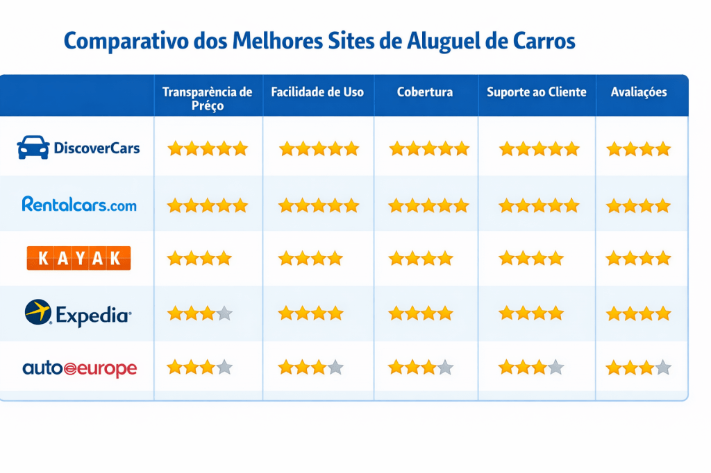 Claro, outros sites como Rentalcars.com, Kayak, Expedia e AutoEurope também têm seu lugar dependendo das suas necessidades específicas — seja preço, cobertura global ou pacotes combinados.