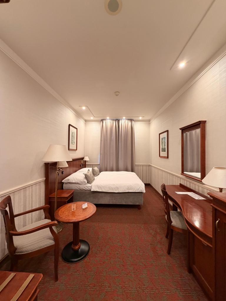 Os quartos seguem um estilo clássico europeu, com decoração elegante e confortável. Cama confortável, banheiro ótimo, sinal de wi-fi, televisão e frigobar. Nosso quarto ainda tinha uma vista linda para uma pracinha.