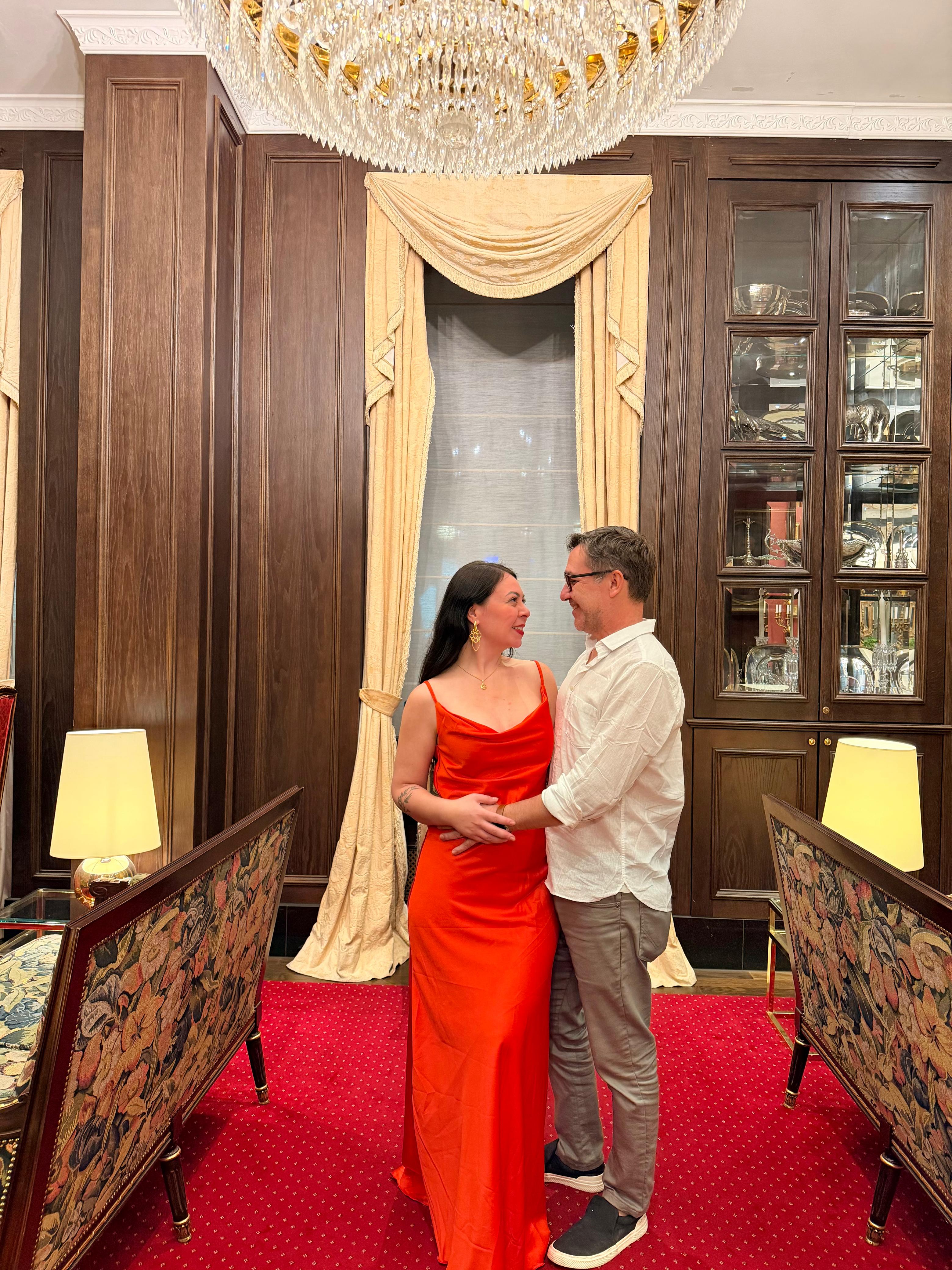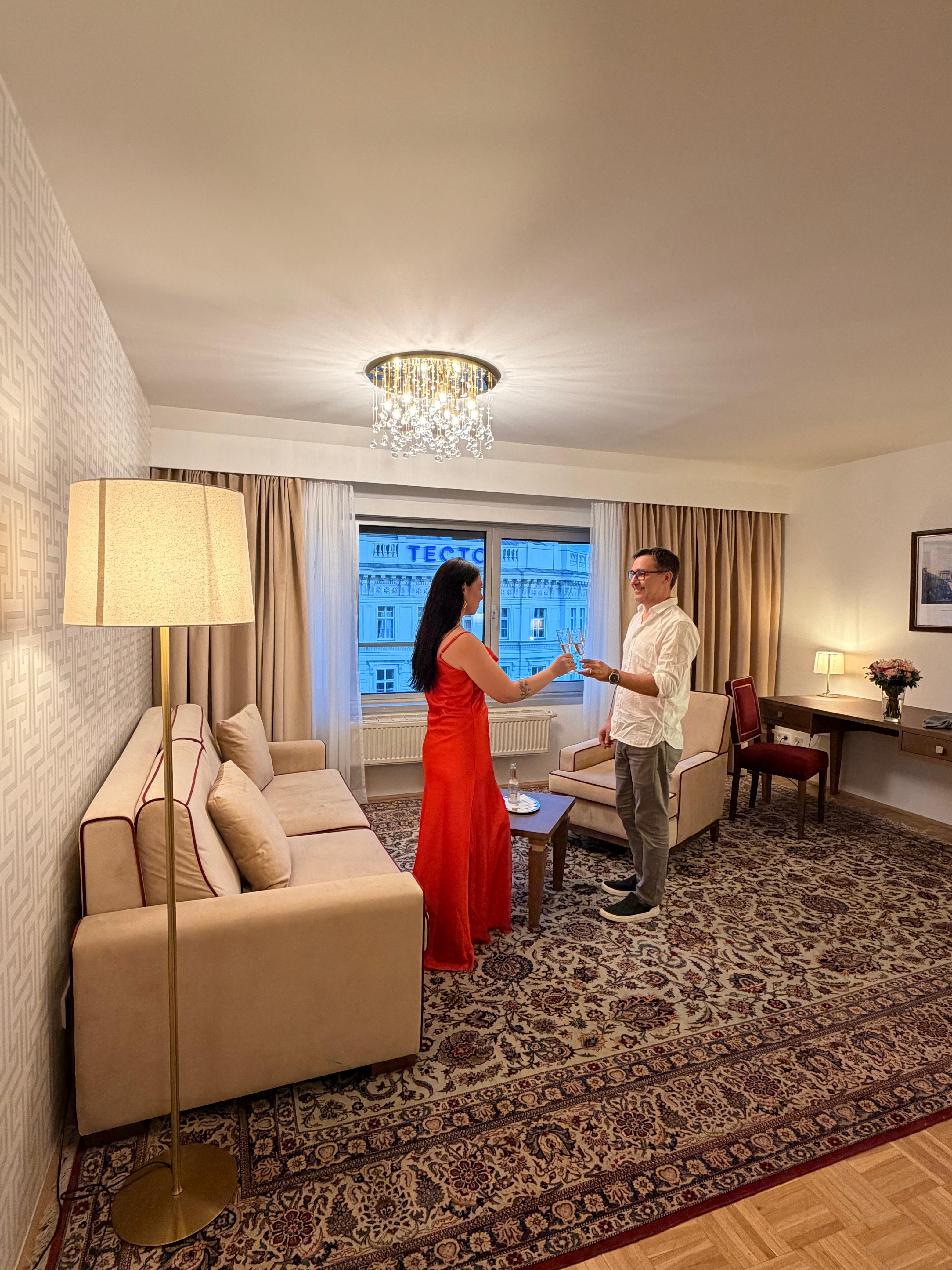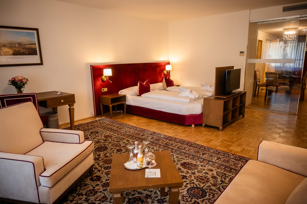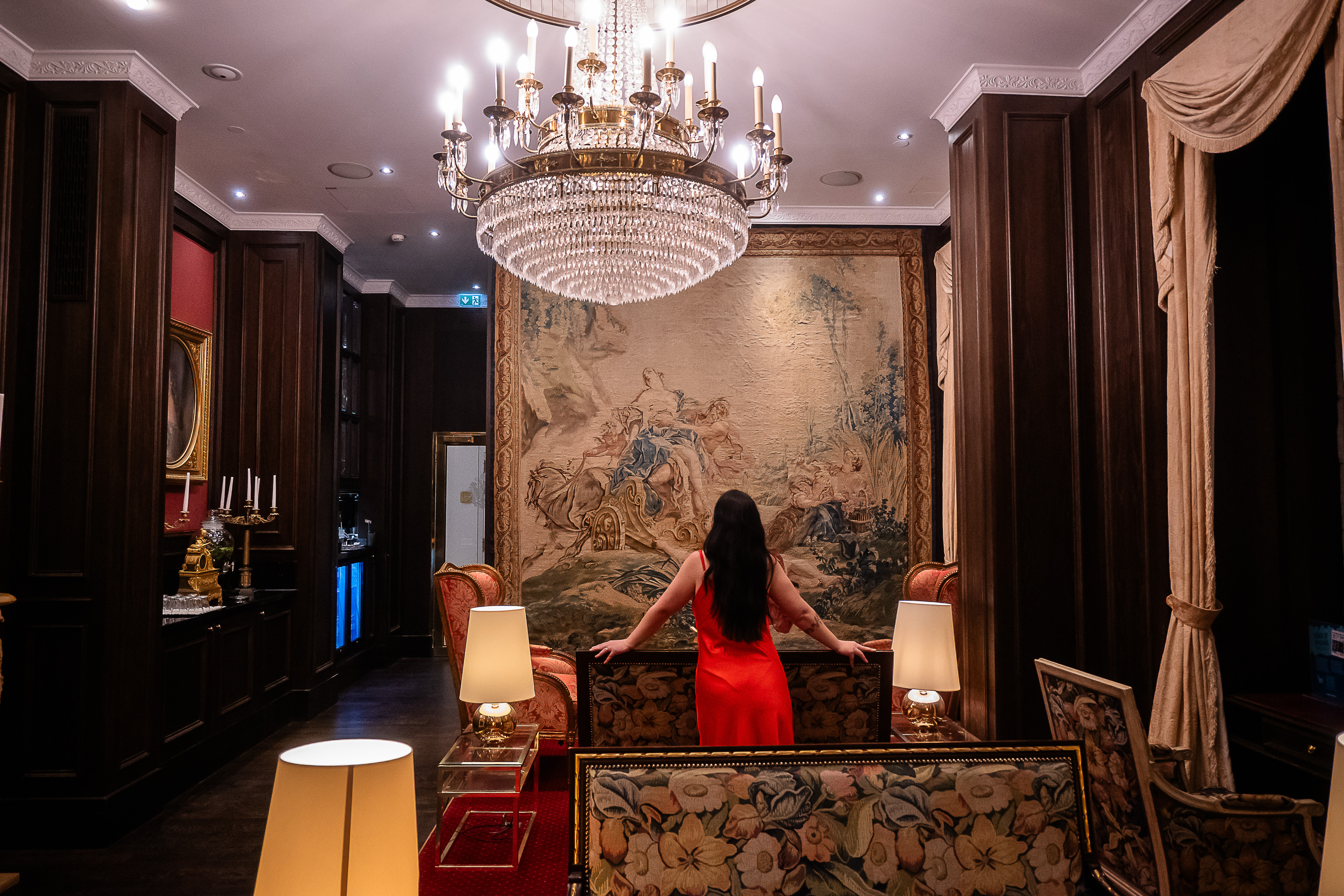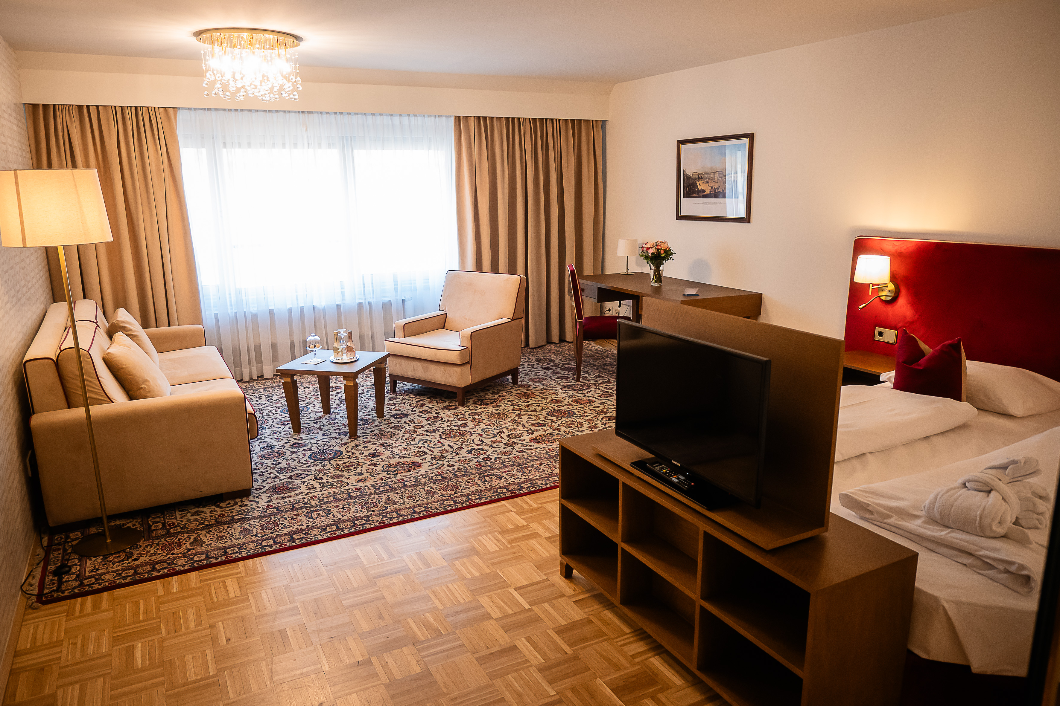 Os quartos são amplos, bem decorados e extremamente confortáveis. Alguns ainda oferecem uma vista linda da cidade, tornando a estadia ainda mais especial. O hall de entrada é uma belíssima sala, com muitos itens de arte e inspiração na Imperatriz Sisi, luxo e requinte em cada detalhe e peça. Esse hotel não é só um lugar para dormir, ele é parte da experiência da viagem, com certeza.