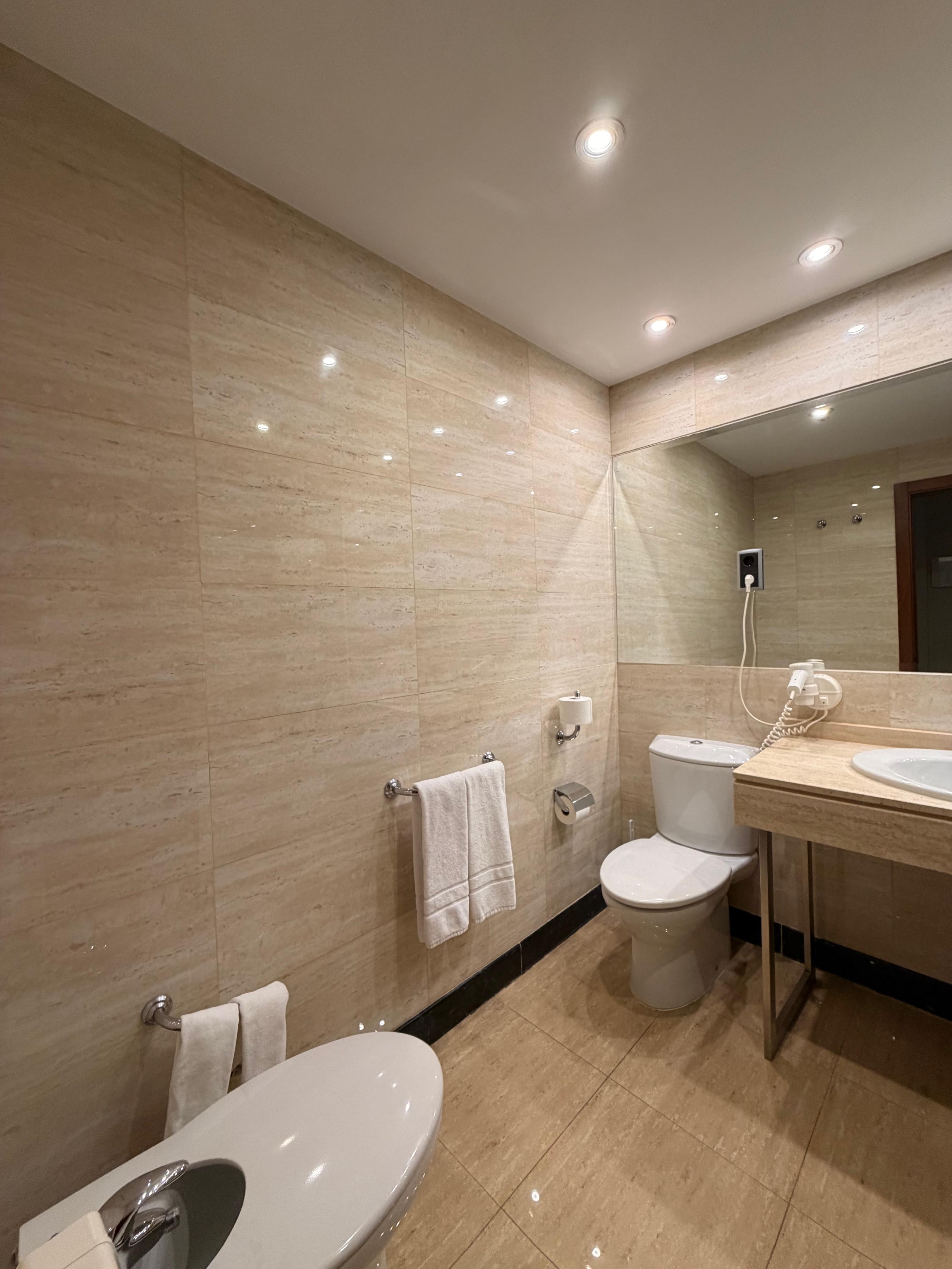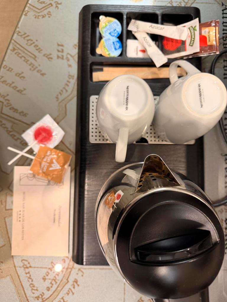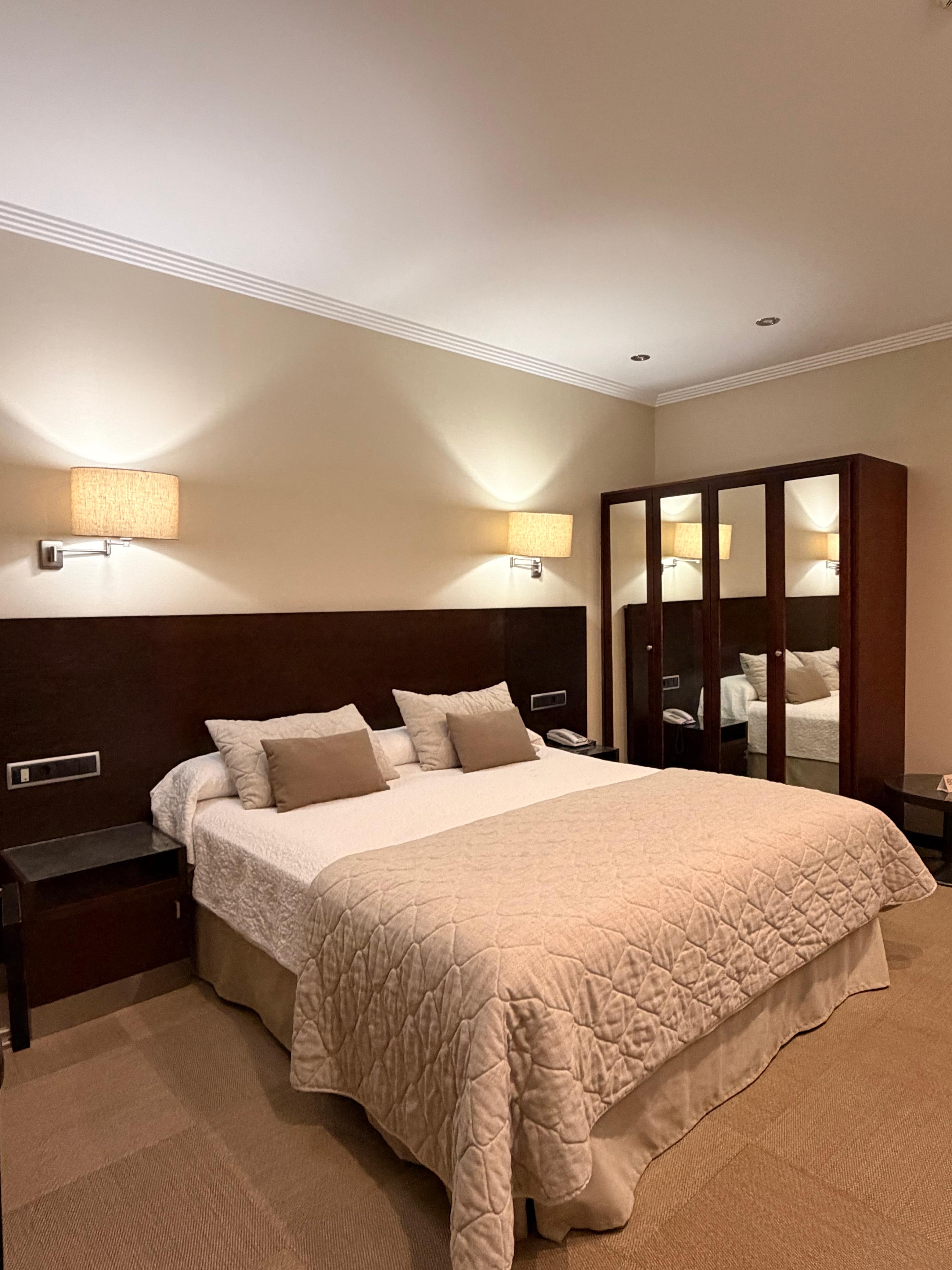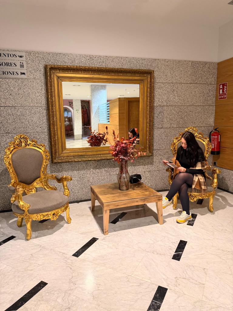 O hotel é 4 estrelas, funciona em um antigo moinho de farinha restaurado, o que traz uma atmosfera histórica única. Achamos muito interessante saber disso! Os quartos são acolhedores, bem equipados e silenciosos (o nosso tinha uma linda vista para uma viela simpática), perfeitos para descansar depois de um dia caminhando pelas ladeiras de Toledo. O banheiro também é amplo e inclui amenidades, inclusive uma mini deo colônia. O hall é bem amplo e o espaço do café da manhã super confortável e elegante. Há ar condicionado e aquecimento central, além de sinal wi-fi forte em todos os ambientes.
